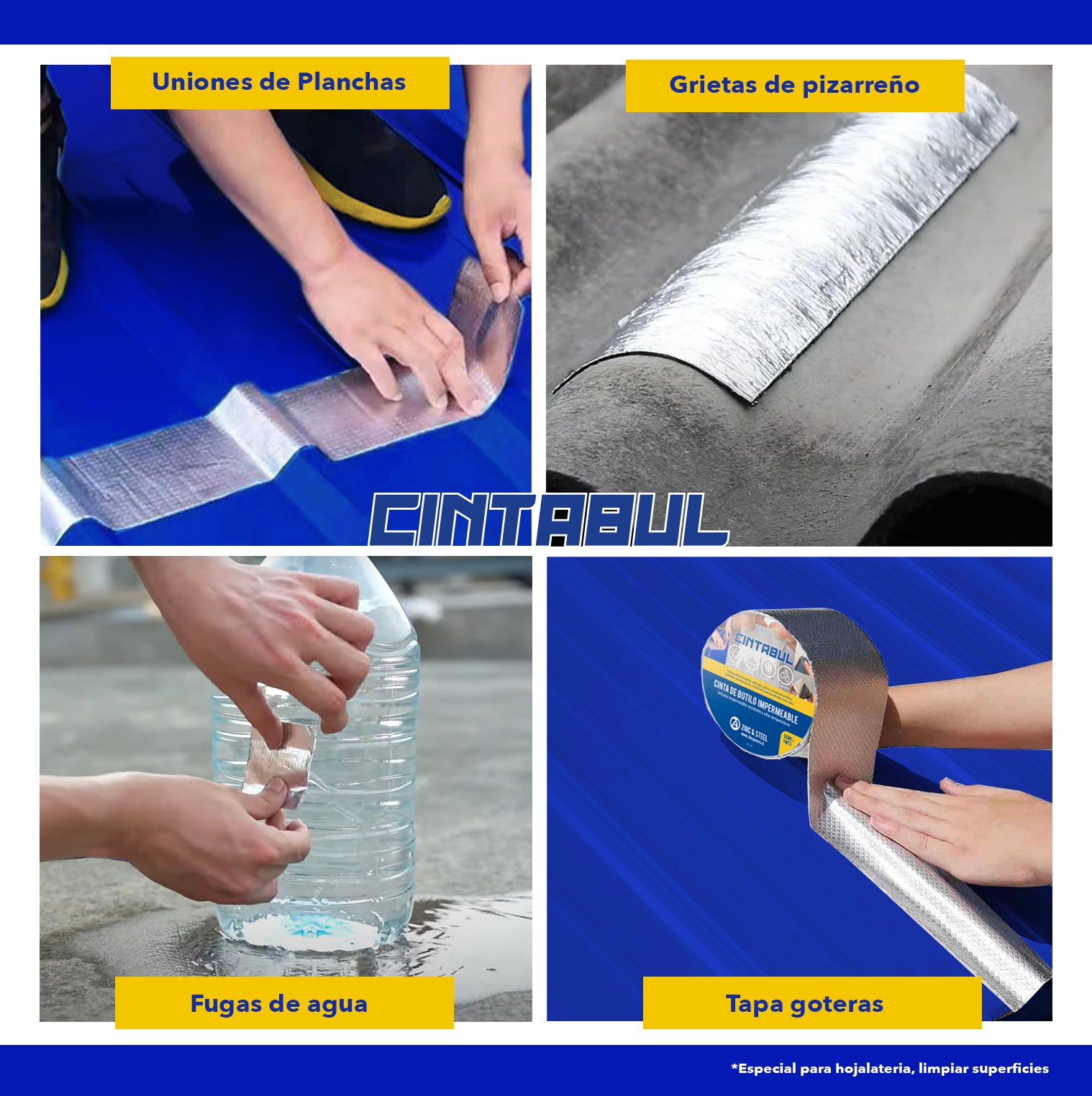 Ideal para sellar juntas entre estructuras de acero y techos de metal, reparar grietas en concreto y proteger superficies metálicas, Cintabul es excelente para reparar goteras y sellar canaletas de hojalatería, asegurando la prevención de fugas de agua.